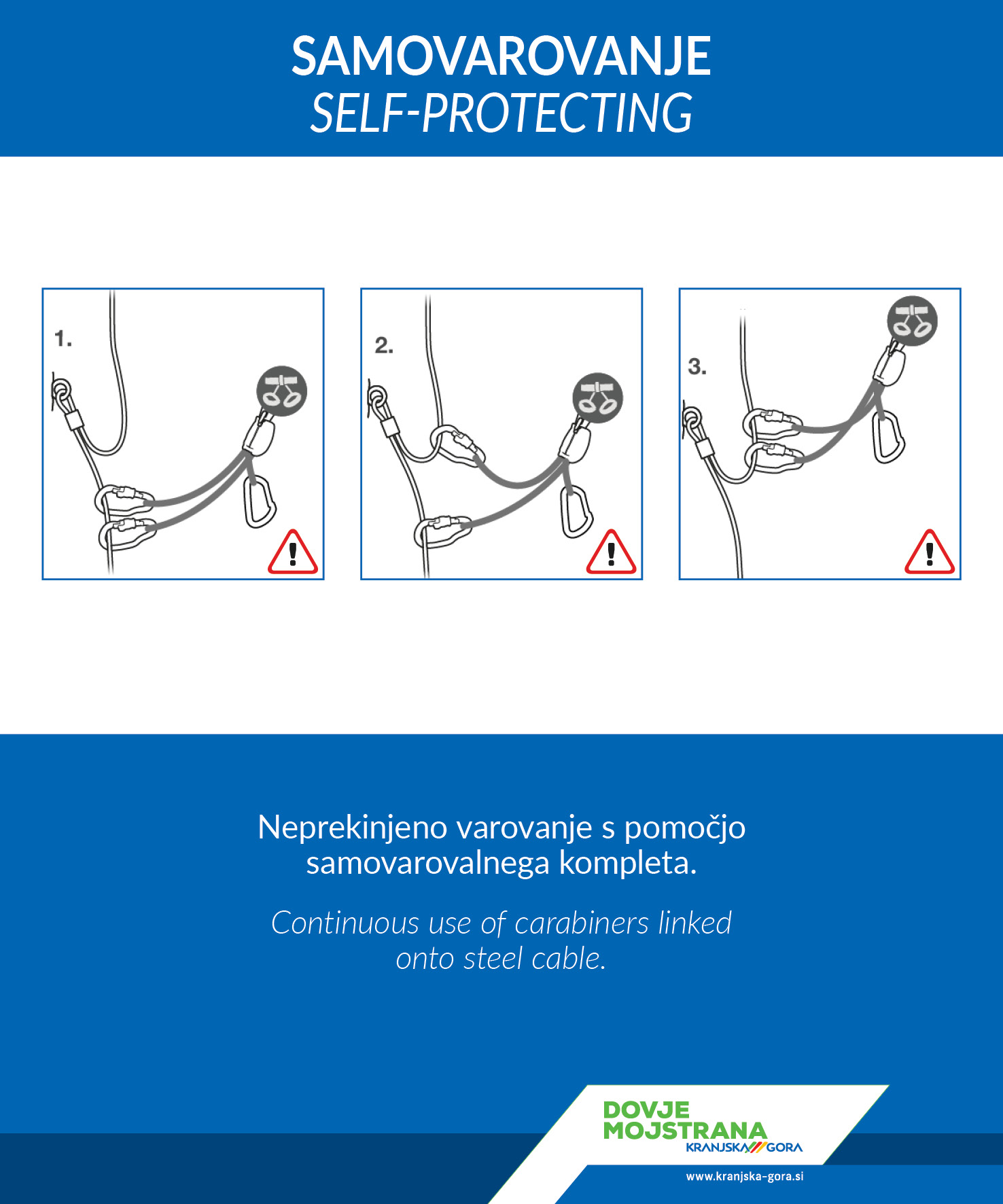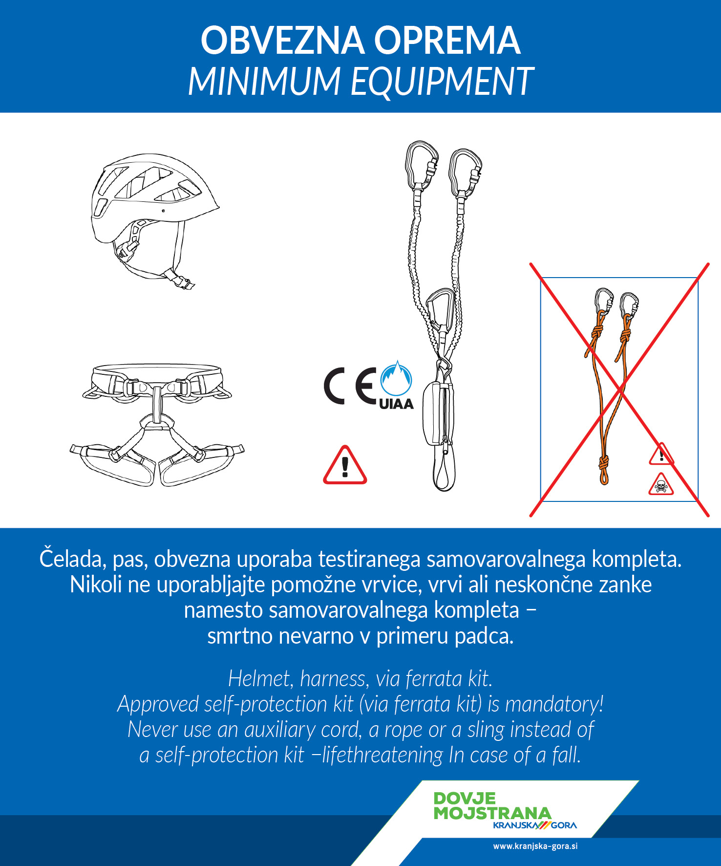 - OBVEZNA OPREMA - Čelada, plezalni pas, samovarovalni komplet, rokavice in ustrezna obutev naj bodo vedno z vami. Nikoli ne uporabljajte neskončne zanke namesto samovarovalnega kompleta!