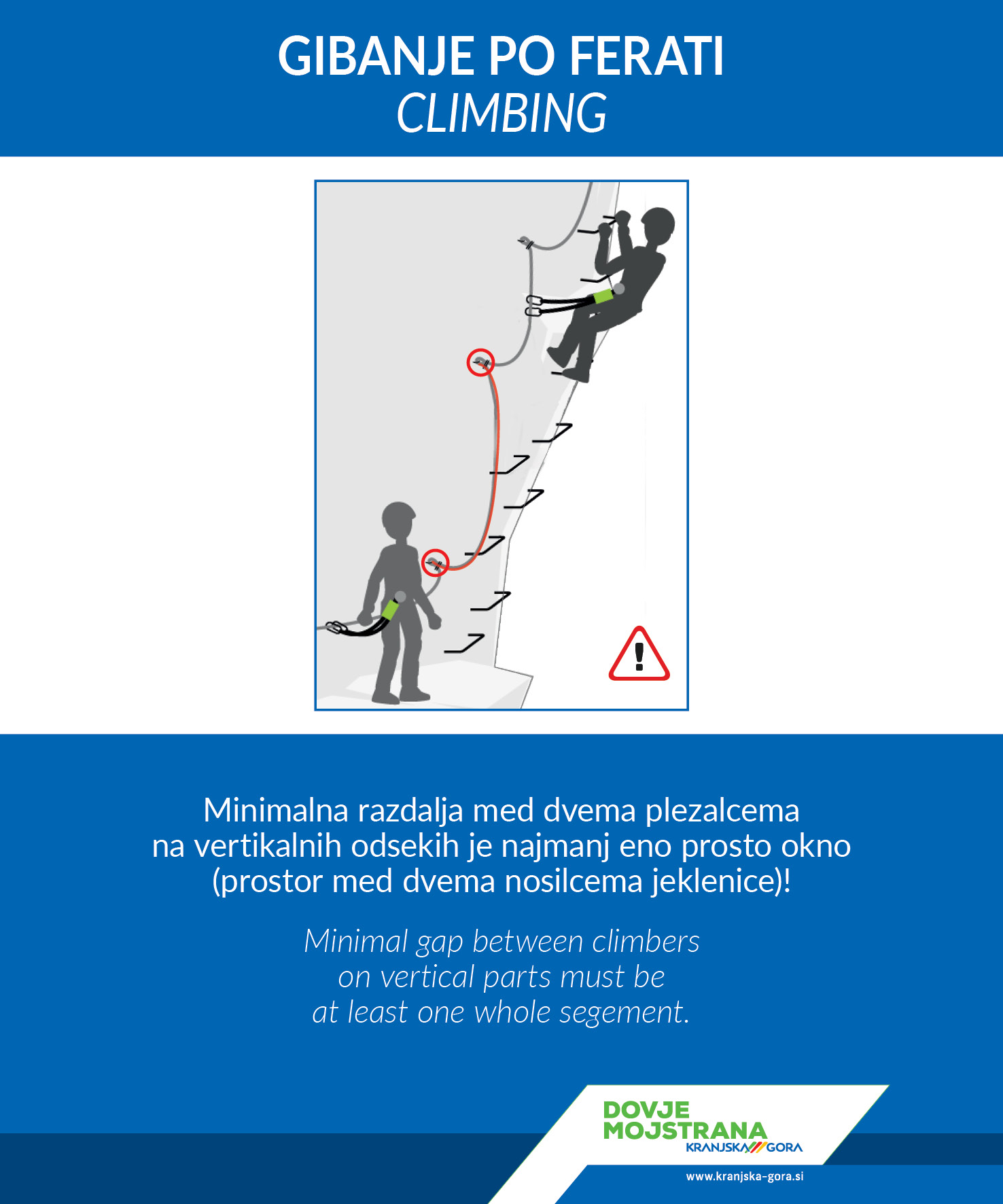 - GIBANJE PO FERATI - vzdržujte ustrezno varnostno razdaljo vsaj enega okna (dolžina jeklenice med dvema nosilcema) še posebej na vertikalnih delih!