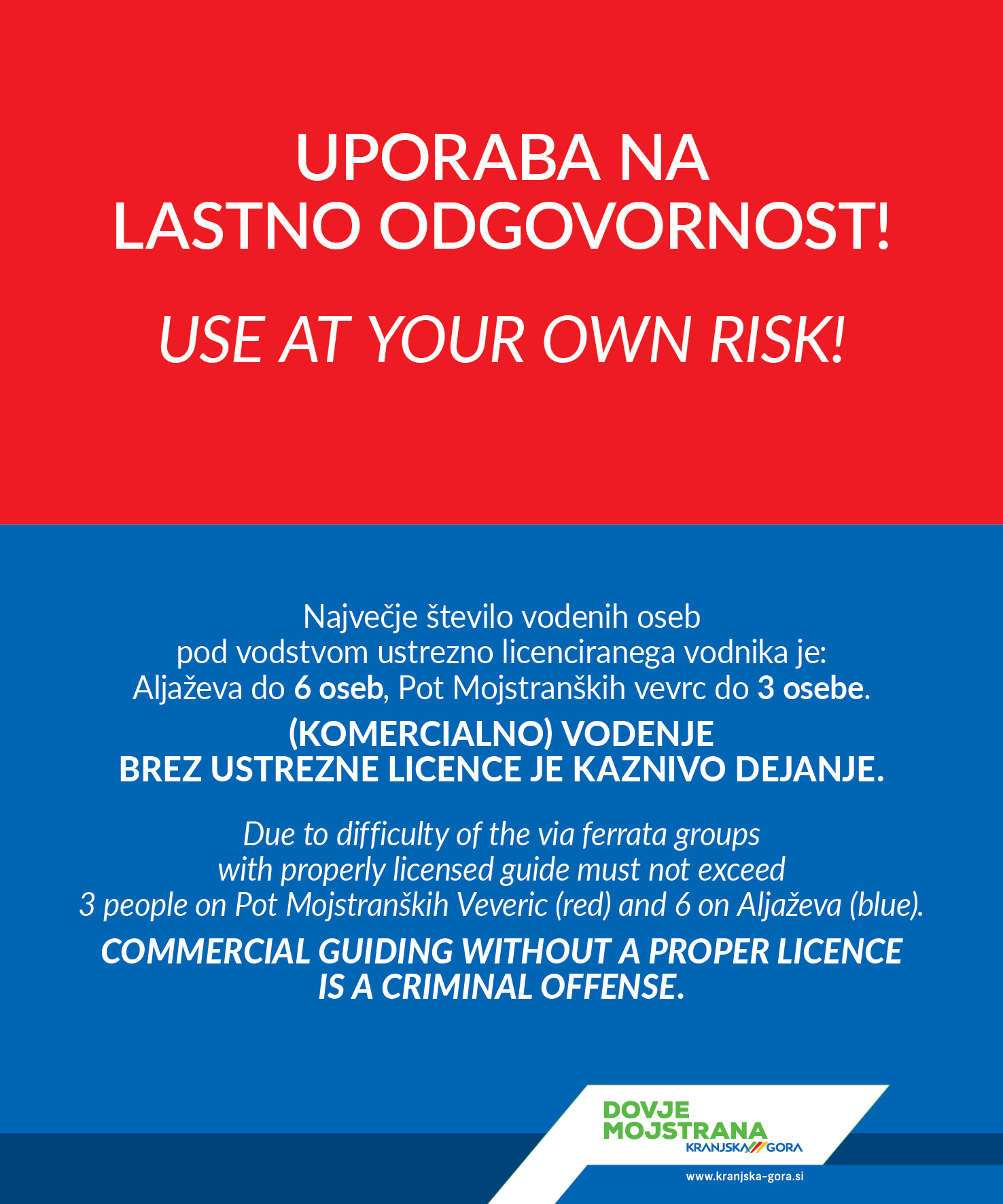 Pri vsakem koraku bodite izredno previdni na proženje kamenja! V ferato stopate na lastno odgovornost! - SKUPINSKI OBISKI IN VODENJE - vsaka ferata ima glede na težavnost smeri določeno največje še varno število udeležencev v skupini (Aljaževa do 6 oseb, Pot mojstranških Veveric do 3 osebe, Hvadnik do 6 oseb, Jerm'n do 3 osebe).